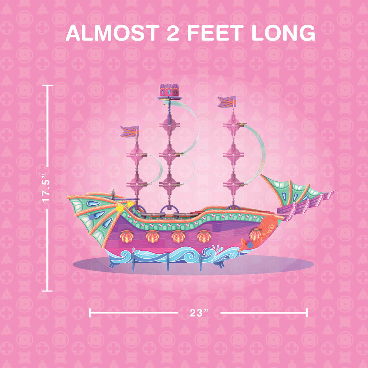 The Marvelous Mermaid Ship Set is assembled using colorful plastic building links and vibrant glossy paperboard panels. These pieces are secured by slotting them together, making for easy assembly and storage. Product designed in California.