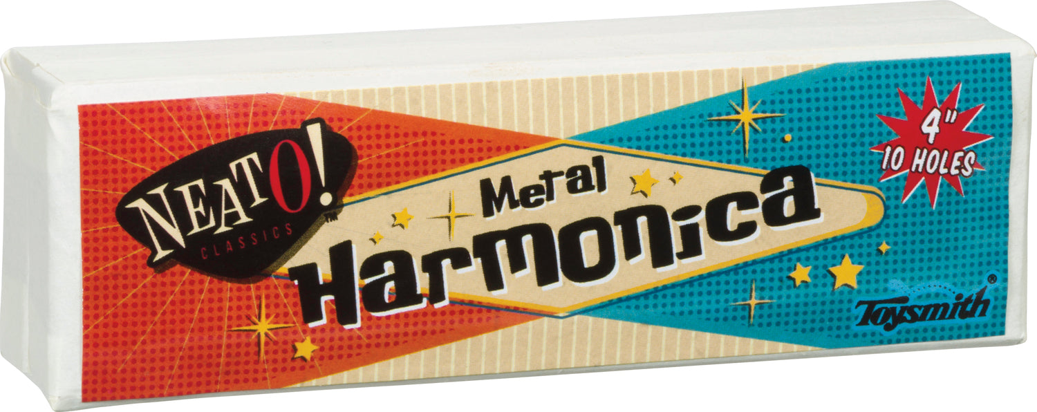 At only 4 inches long, this easy-to-hold metal harmonica from Neato!® features a 10-hole design for easy musical fun. Fits easily into small hands and helps cultivate a sense of sound, musical scale, and play. Comes in an assortment of beautiful colors with metal luster inside a 4.25 x 1-inch portable hinged case.