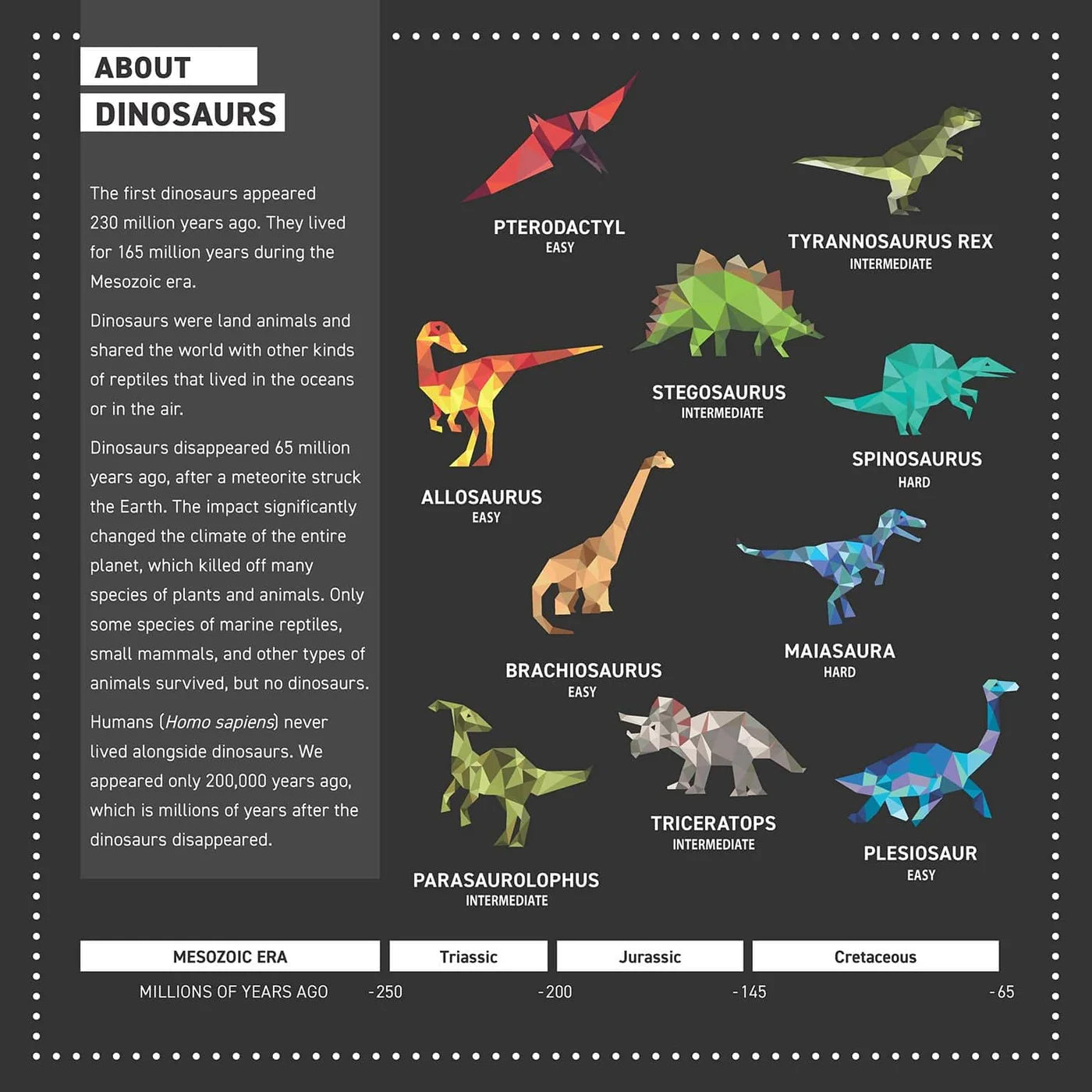 Create stunning works of mosaic art with stickers! This distinctive poly-art sticker painting book for kids features a collection of 10 geometric designs of various dinosaurs – from T-rexes and pterodactyls to triceratops, stegosaurus, and more. 44 Pages of fun.