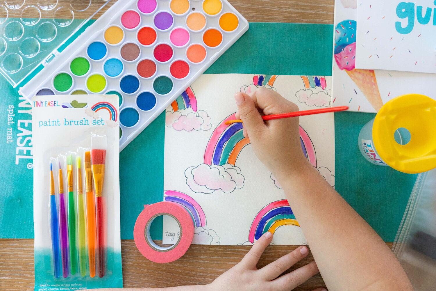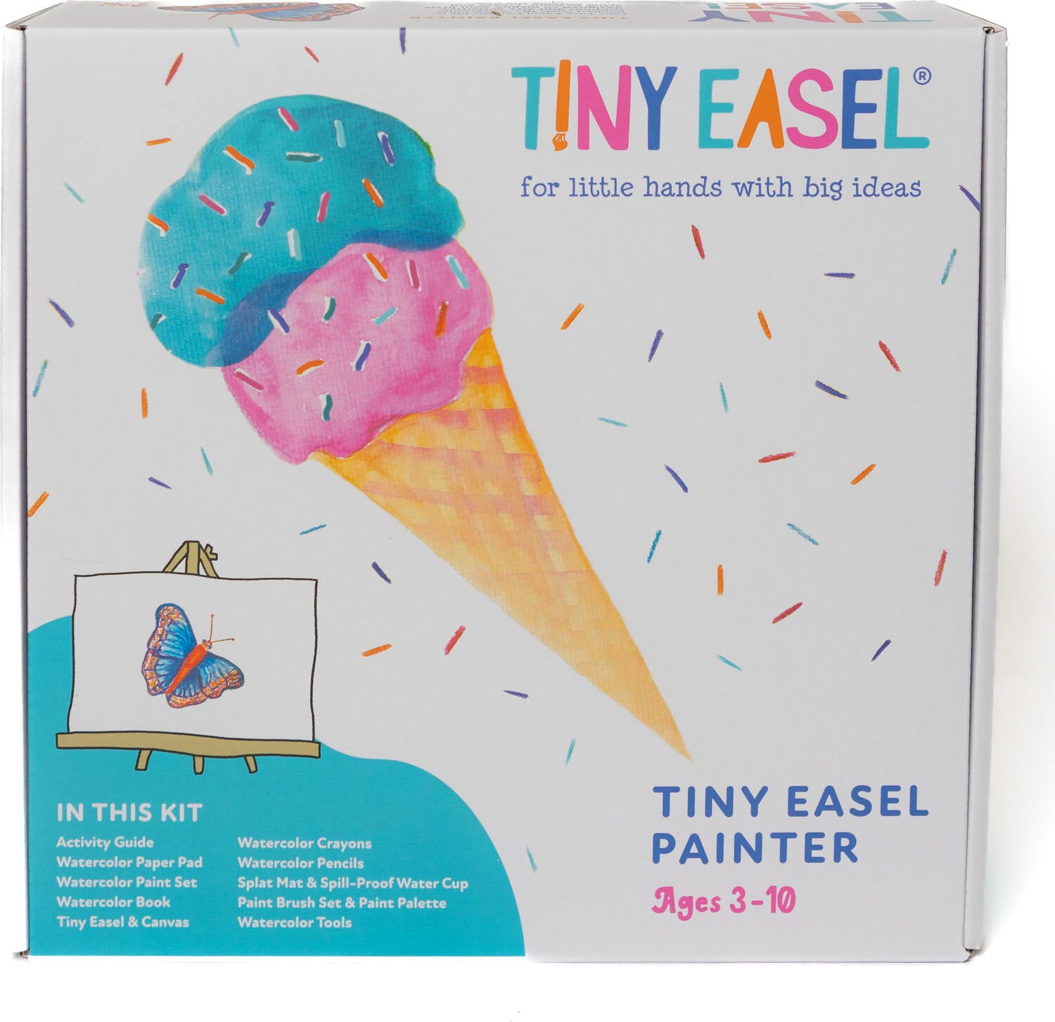 Our Tiny Easel Painter kit is an all-in-one art kit for your little artist to explore with watercolors. Why do we love watercolors for tiny painters? It’s stress-free for parents with great results! Plus, it’ll keep your kids occupied for a month and beyond. The paints are all washable, great for multiple-use, easy set-up and clean-up, and fun to work with.