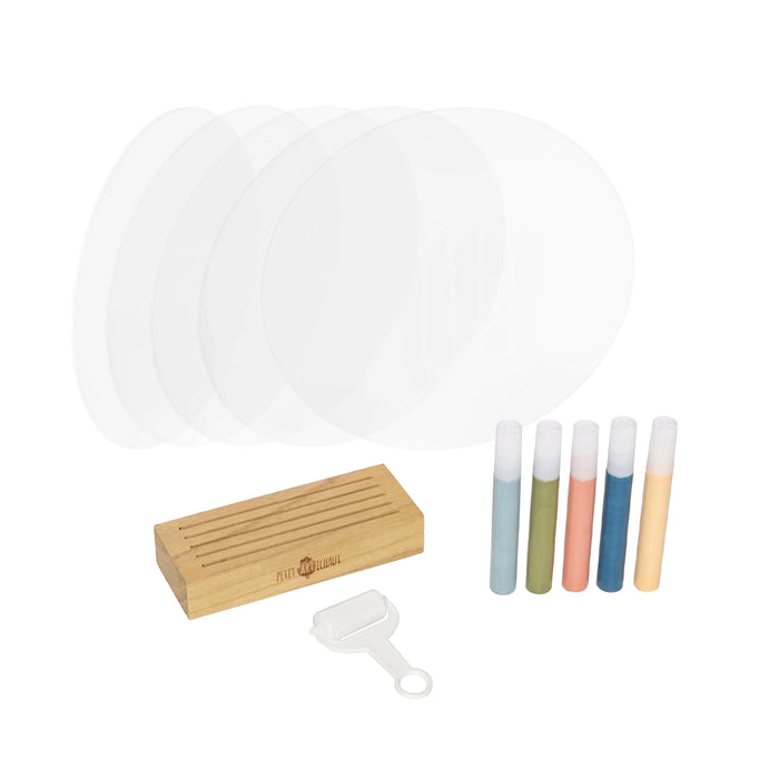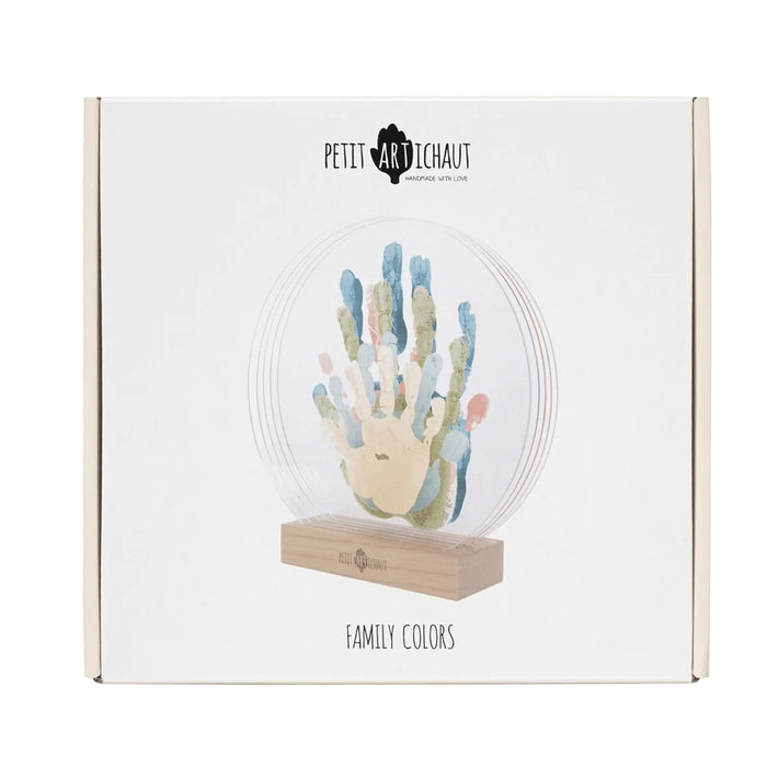 Family Colors allows 5 family members to each make their own print on an individual plexiglass panel and then combine them into a colorful, layered display. Each kit includes 5 transparent panels, 1 pretty wooden base for support, 5 paint tubes, 1 roller for application, and instructions to easily create the prints. Family Colors offers a modern and original way to display family unity and love through a unique interior decoration.