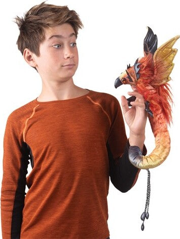 Rising like the sun, the Folkmanis Phoenix Wristlet is a flaming beauty to behold. Capture the spirit of light and hope with this legendary bird designed with brilliant ombre body printing with hanging elements, vinyl accents, plush flames, movable head and an ashed tail that wraps around your wrist with a magnetic clasp.