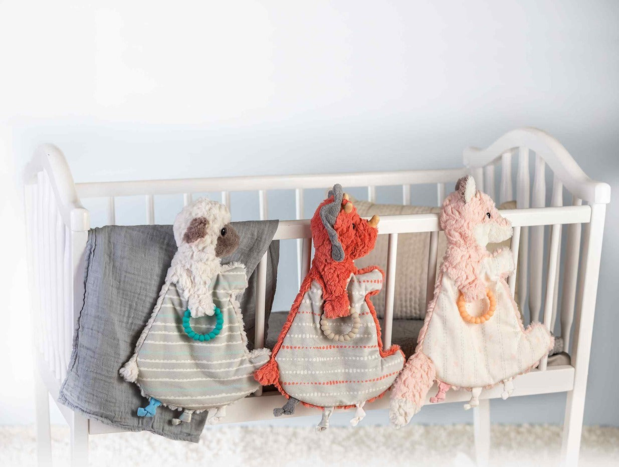 Snuggy Nuggles are perfect for baby’s imagination and rest. Super soft with a soothing teether and knots for baby’s fun and play