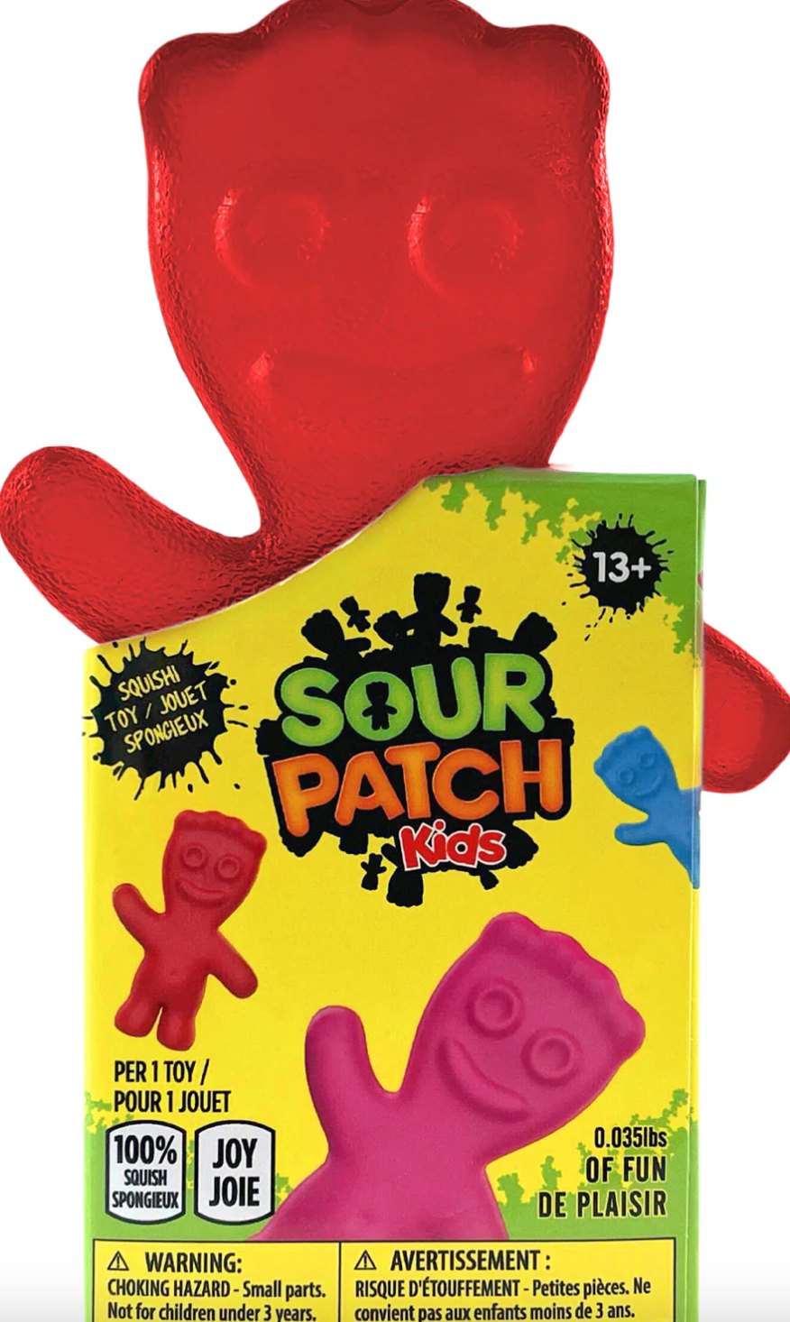 A little bit sour, a little bit sweet: no matter how you're feeling, this 5" palm-sized translucent Sour Patch toy is perfect for fidgeting. Squish and squeeze your worries away while enjoying the scent of your favorite candy: Orange, Blue Raspberry, or Strawberry! Collect all 3 styles for sensory satisfaction that's sweet for kids and adults! Each sold separately.
