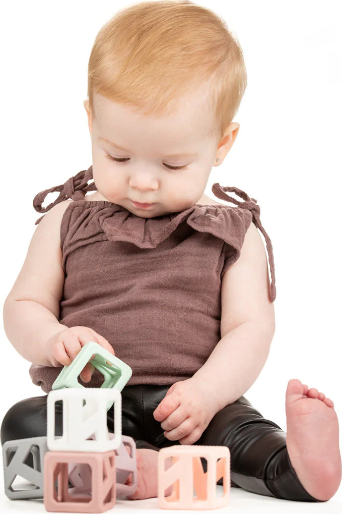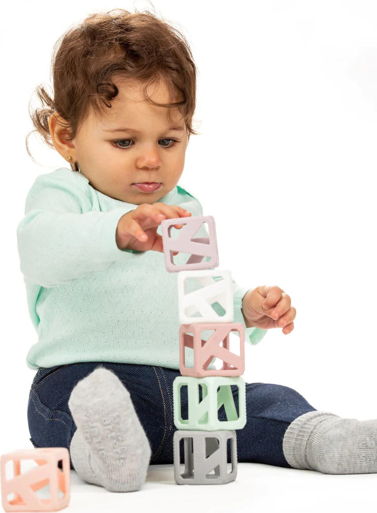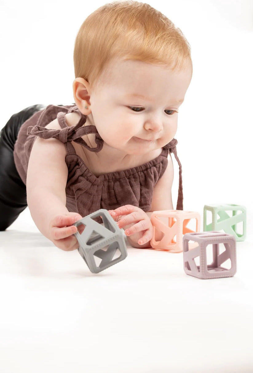 The Stack N Chew Mini Cubes are a developmental teething toy. They are BPA-Free and made of food-grade silicone, making it safe for baby's tender gums. The flexible holes help strengthen baby's gripping skills. The contrasting modern colors stimulate hand-eye coordination and promote motor skills such as stacking and carrying. Easy to travel with, it encourages imagination - even for water play!