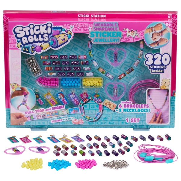 - Contents: 32x Sticki Rolls (320 Stickers), 144x Beads, 8x Cords with Clasps, 6x Charm Tags, 2x Sticki Necklace Pendants, 1x Collector's Booklet