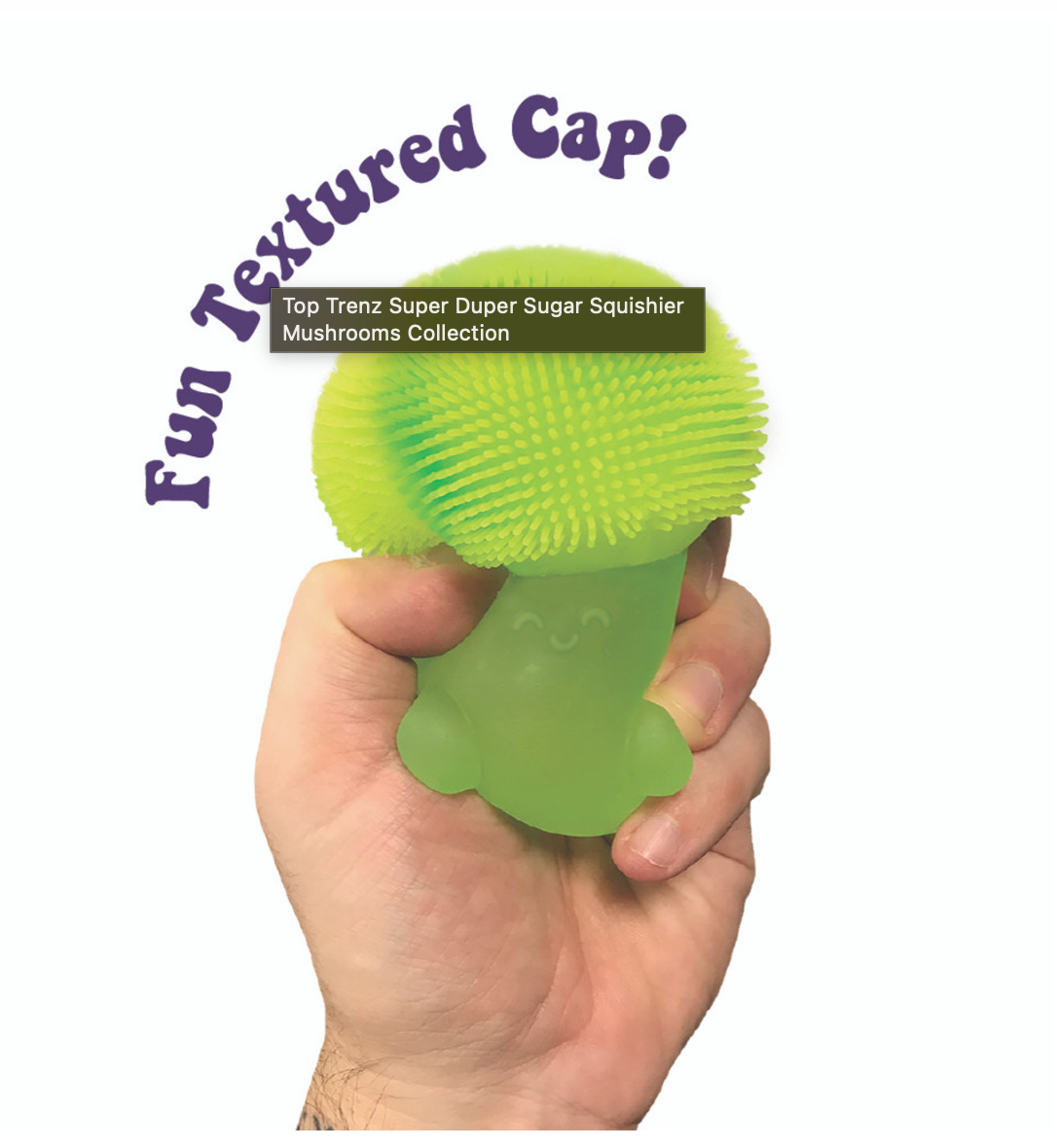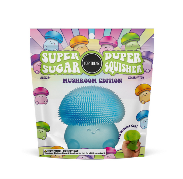 Meet the far-out fidget Mushroom that will have you squishing and squeezing for hours. Super Duper Sugar Squisher Mushrooms have a cool-to-the-touch exterior with a non-toxic gooey center that slowly bounces back to its original shape. Super Duper Sugar Squisher Mushrooms also have a texture fuzzy cap for a double sensory squishy sensation.