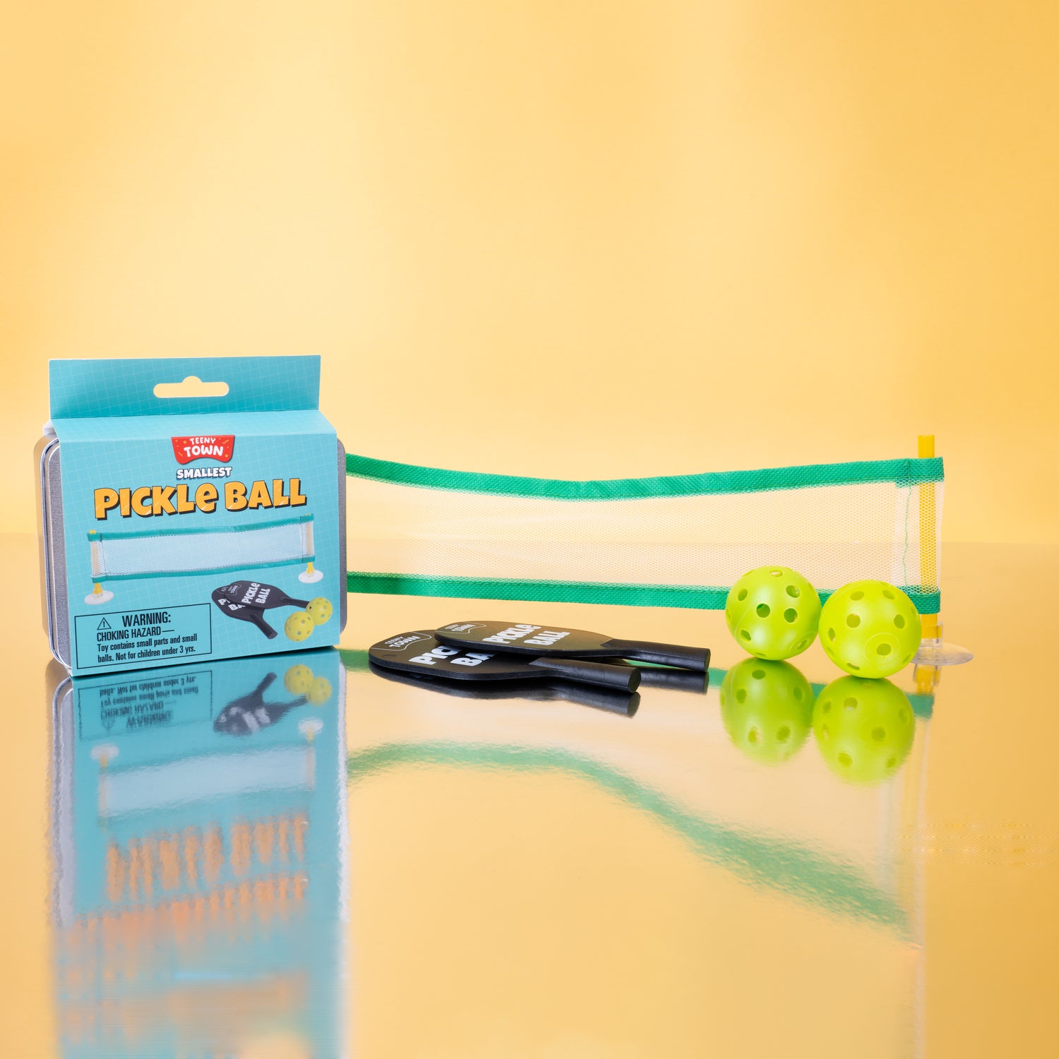 Bring the exhilaration of a fast-paced paddle sport to the miniature world with Teeny Town Pickle Ball! This compact set includes everything you need for a fun game of Pickle Ball.