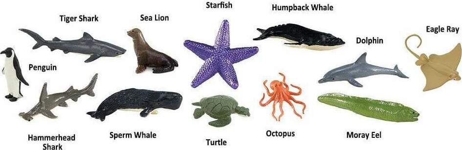 Complete with some of the most iconic ocean creatures this Toob brings together 12 of your favorite marine mates, including a sea lion, eagle ray, starfish, turtle, penguin, octopus, humpback whale, sperm whale, moray eel, hammerhead shark, tiger shark, and a dolphin!