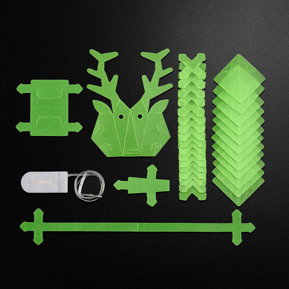 With 40 Creatto pieces and a string of 5 LED lights, you can build a green reindeer or a fir tree. The models have loops for use as ornaments. Battery-powered lights require 2 CR2032 batteries. Suitable for ages 8 and up.