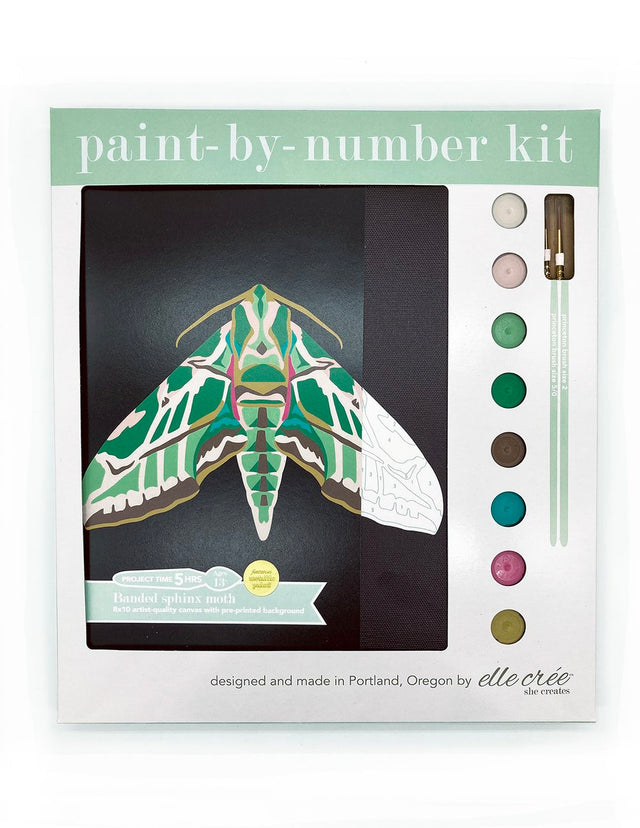 “Banded Sphinx Moth” features an encyclopedia plate that showcases this uniquely patterned Banded Sphinx moth. This kit features gold accent paint! The preprinted background features the name of the moth on rich black. Completing the painting can take between 3-5 hours. When completed, select a frame at your local craft store and display! Recommended for ages 13 and up.