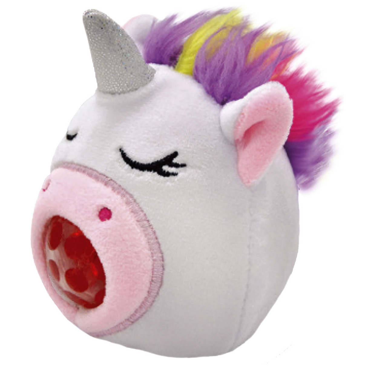 - Squishable plush unicorn features no-mess expanding gel ball.
