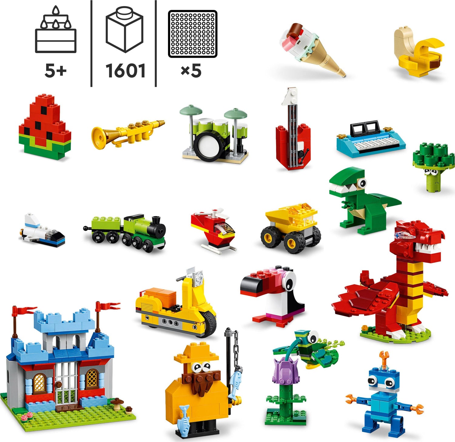 The set includes 1,601 LEGO bricks, 5 LEGO baseplates, 20 mini build ideas, 4 standard build ideas, exciting building challenges plus extra bricks in the set for creative building. This LEGO Classic box includes 4 separate building guides for group play. The easy-to-follow pictorial instructions ensure that even first-time builders can experience the pride and joy of constructing their own LEGO toys, including a toy trumpet, guitar, piano, drum kit, red dragon, dinosaur, flower, duck, train, truck and castle.