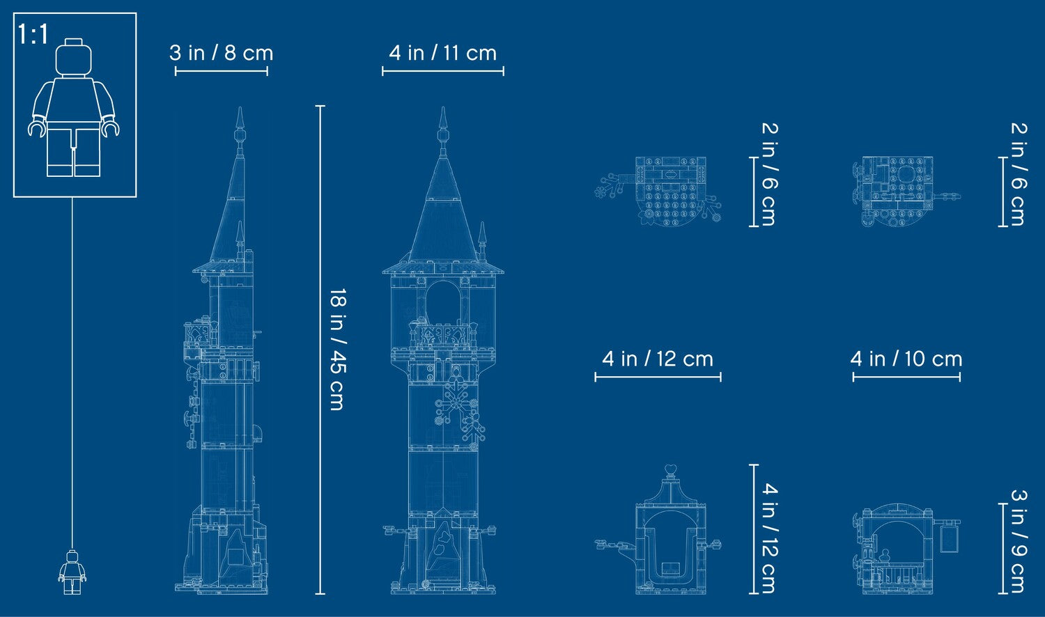 - A 4-level tower full of details. With the tower measuring over 17.5" (44cm) high, 4" (11cm) wide and 3" (8cm) deep, this expansive buildableset is designed to be constructed and played with again and again.