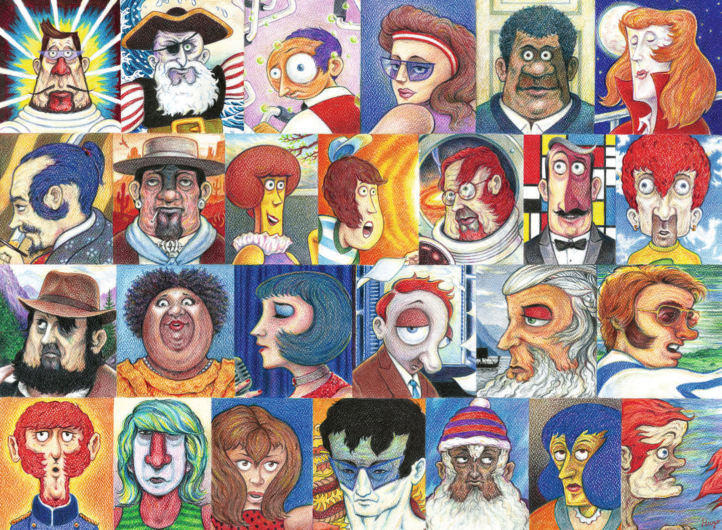 Question: Can you find the unique characteristic of each illustrated visage in our Typefaces puzzle? Answer: Artist Hugo Maciel has cleverly incorporated a letter of the alphabet within each face in this whimsical graphite and colored pencil collage, exclusively from Ravensburger! Bold and imaginative, we love how he used subtle shading and hairstyles to fashion each face into a letter — sure to bring joy to your puzzling experience, from A to Z!