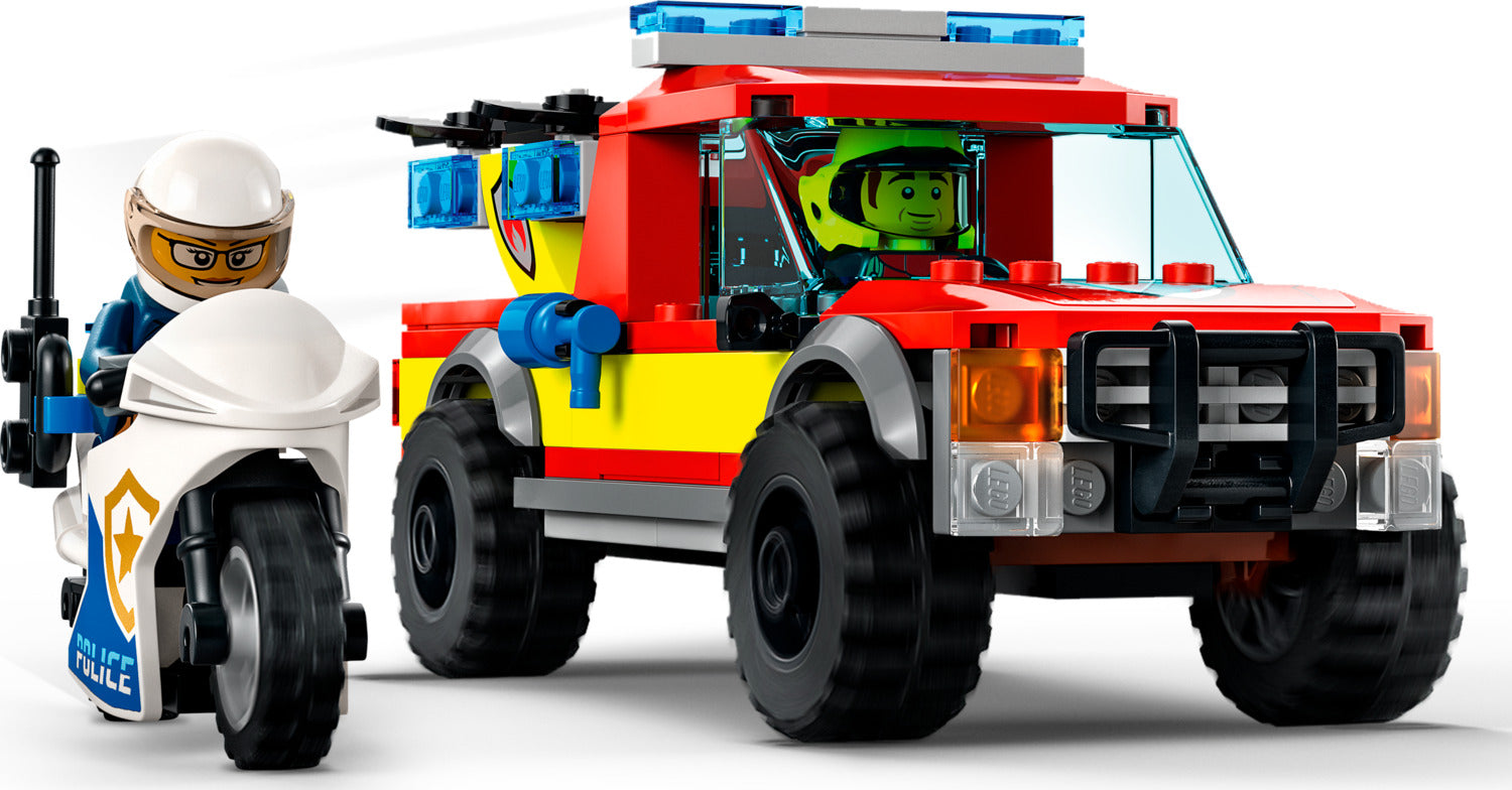 - What's in the box? – Includes a fire pickup with a drone, police motorbike, crook's car, fire scene with traffic light, cat figure and 3 minifigures, including LEGO® City TV character, Bob