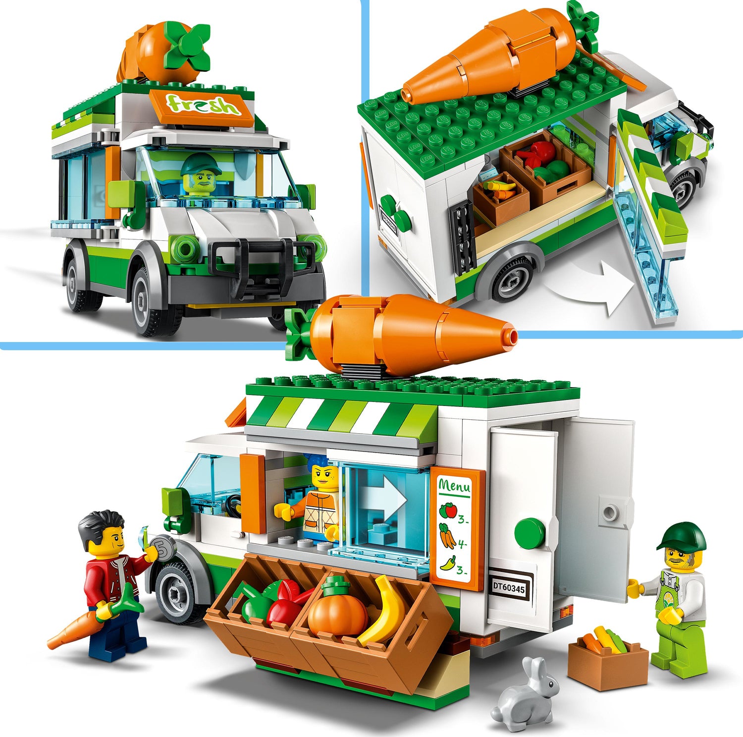 - This farm toy for kids for age 5+ includes a mobile farm shop, fruit and veggie patch, plus 3 minifigures, a rabbit figure and lots of accessories