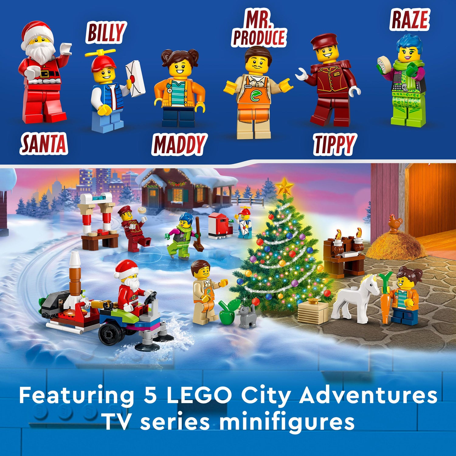 - Christmas Advent Calendar includes Billy, Maddy, Mr. Produce, Tippy and Raze LEGO City minifigures and a winter wonderland playmat on the box/li>