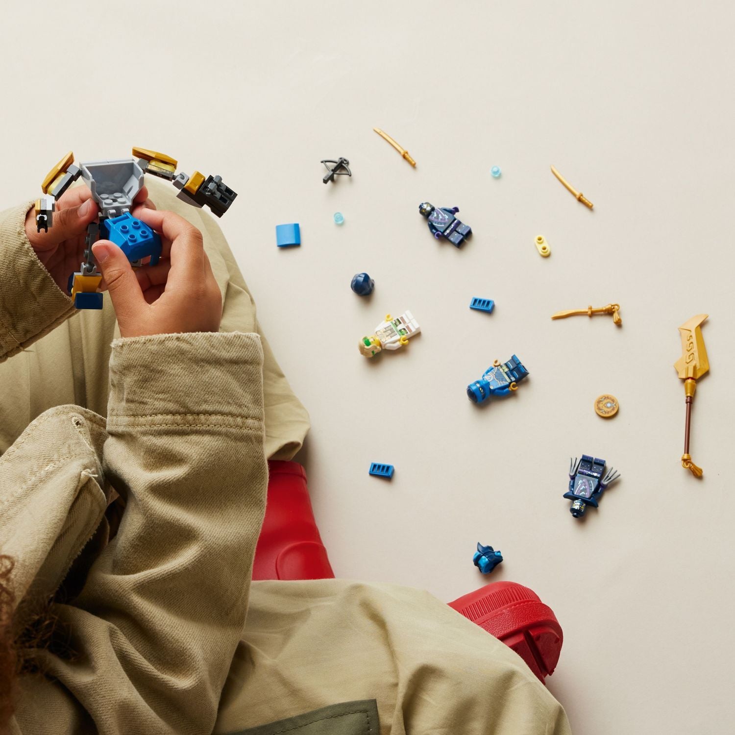 - Weapon accessories – Jay is armed with a golden sword, Master Lloyd has 2 golden katana sword accessories, and the Wolf Mask Guard has a crossbow accessory