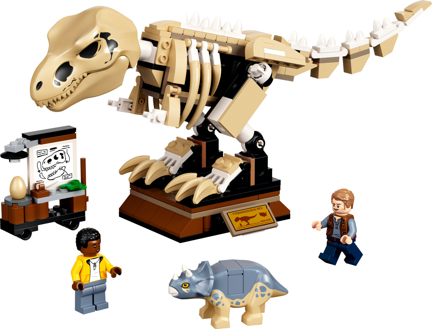 - Includes Darius and Owen Grady minifigures, a baby Triceratops toy figure, a buildable drawing board, plus accessory elements including a pointer stick, dinosaur egg, teeth fossil and a leaf.