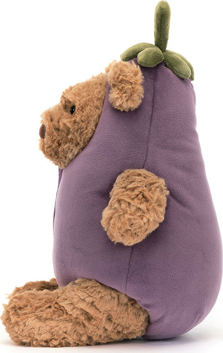 Bartholomew Bear Aubergine is all dressed up! Jellycat's toffee bear wears a purple suedette costume, fastened with velcro for easy removal. The veggie suit has stitched faux-buttons and the cute stalk hate even has ear-holes! A kooky gift for a veggie friend or any Bartholomew fan.
