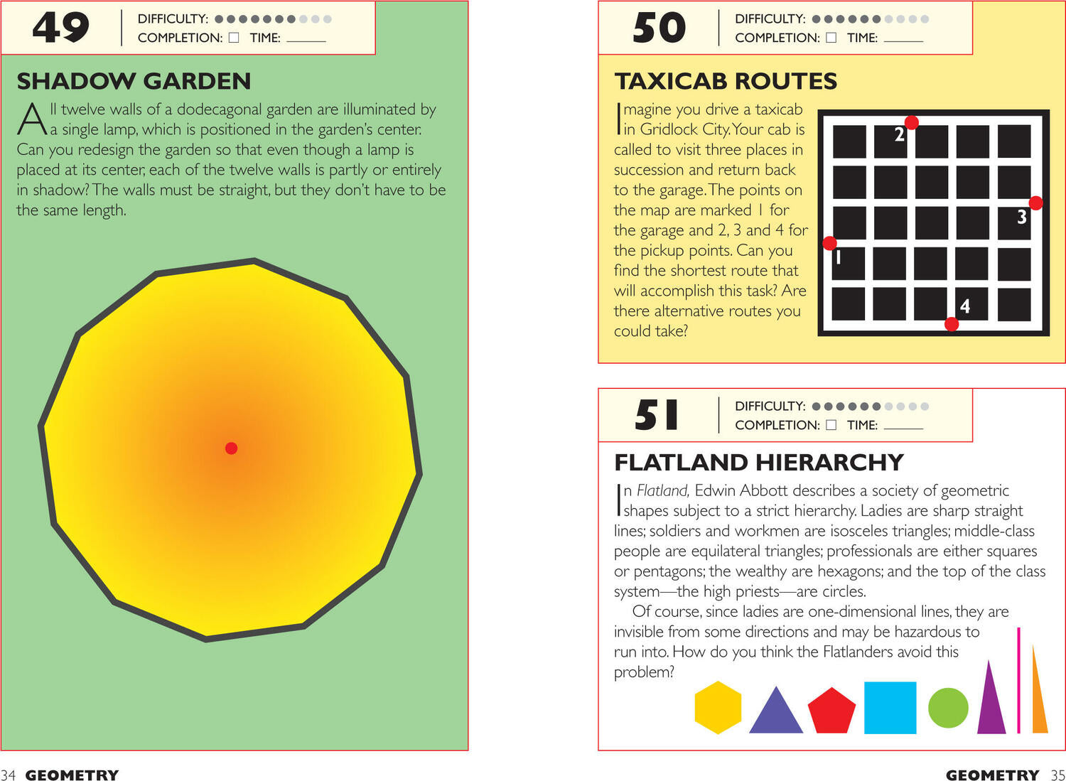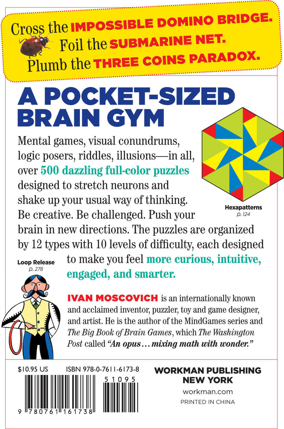 Here are mental games, visual challenges, logic posers, riddles, and illusions, each designed to stretch neurons and give the brain a workout—all in a format that will fit in your pocket. The puzzles (both original and mind-boggling adaptations of classics) are rated in difficulty from level one to ten, but even the easiest are guaranteed to make the solver feel smart.