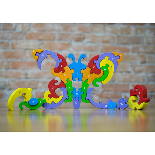 BeginAgain Butterfly A-Z Puzzle is a natural wooden toy, handcrafted from plantation-grown rubberwood, stained with child-safe, non-toxic dyes. By making children's games and puzzles out of plants, not plastic, we are creating a healthier planet with healthier kids. The Butterfly A-Z Puzzle measures 7" wide x 10.25" long in a tray that's great for storage, travel, display, and wrapping up for a gift!