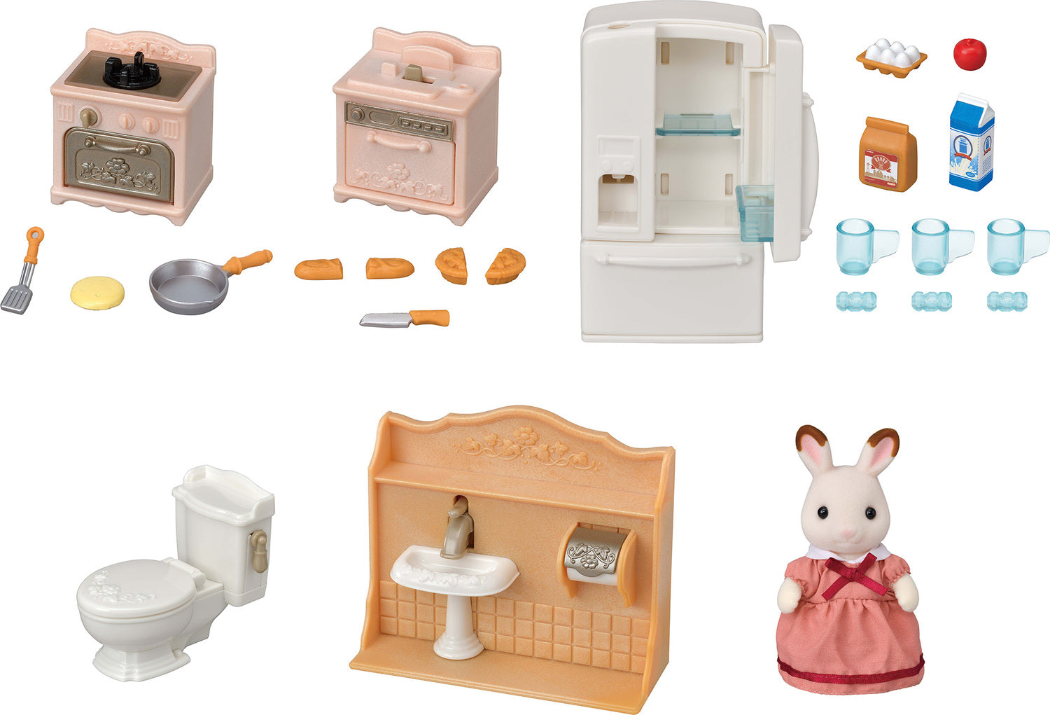 Playful Starter Furniture Set lets you turn the knob on the hob to reveal a flame. Place the apple pie or baguette on the cutting table and cut them with the knife. Place a cup in the fridge ice dispenser to make ice come out. Open the tap over the sink for "water" to come out. Pull the toilet handle to "flush". Combine with Red Roof Cozy Cottage for even more enjoyable pretend play (sold separately). Hopscotch Rabbit Mother, Cooker, Kitchen Counter, Drawer, Fridge, Freezer Compartment, Tray, Sink, Toilet, Apple Pie (Half) x2, Baguette (Half) x2, Knife, Frying Pan, Spatula, Pancake, Flour, Egg, Milk, Apple, Cup x3, Ice x3 (a total of 27 pieces)