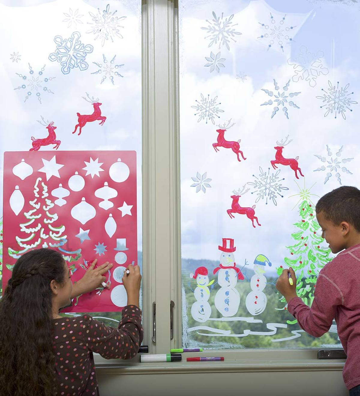 Rather than hanging decorations in your windows, let your kids stencil festive holiday art on them. All it takes is our holiday-themed stencils kit (that includes versatile chalk-based window markers) and a little holiday spirit.