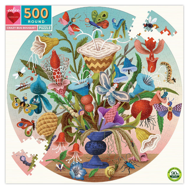 Take on the extra challenge of a round puzzle! This unusual bouquet of fanciful flowers attracts wacky bugs of all kinds, creating a detailed scene. From butterflies with chevron wings to centipedes wearing hats, the Crazy Bug Bouquet makes for a delightfully silly and strange puzzle.