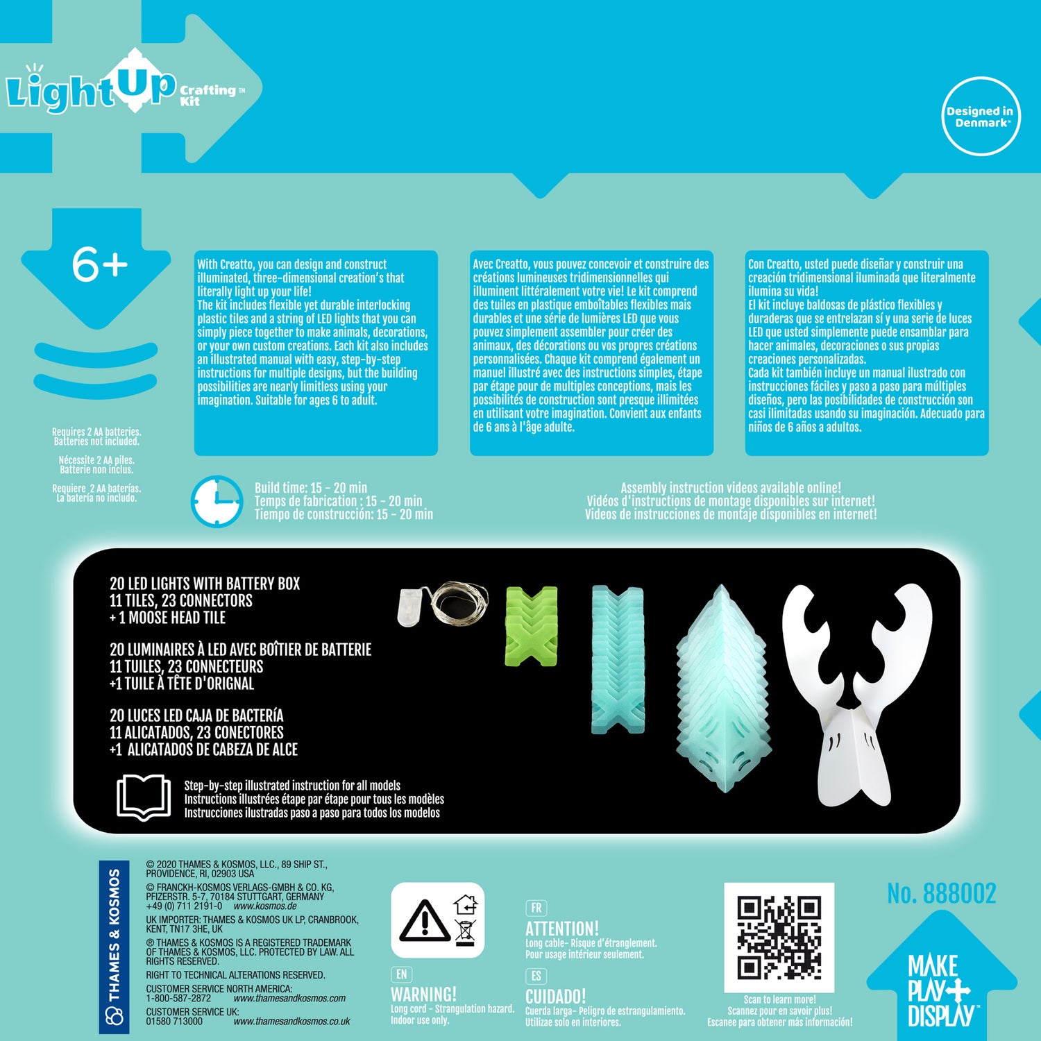 With 35 Creatto pieces and a string of 20 LED lights, you can build a moose, beetle, dinosaur, and tree. Battery-powered lights require 2 AA batteries. Suitable for ages 6 and up. Creatto is a simple yet versatile building system that consists of just two primary components that can be woven together into countless 3D creations. The flexible yet durable plastic tiles interlock quickly and easily for all skill levels; no additional materials or hardware required!