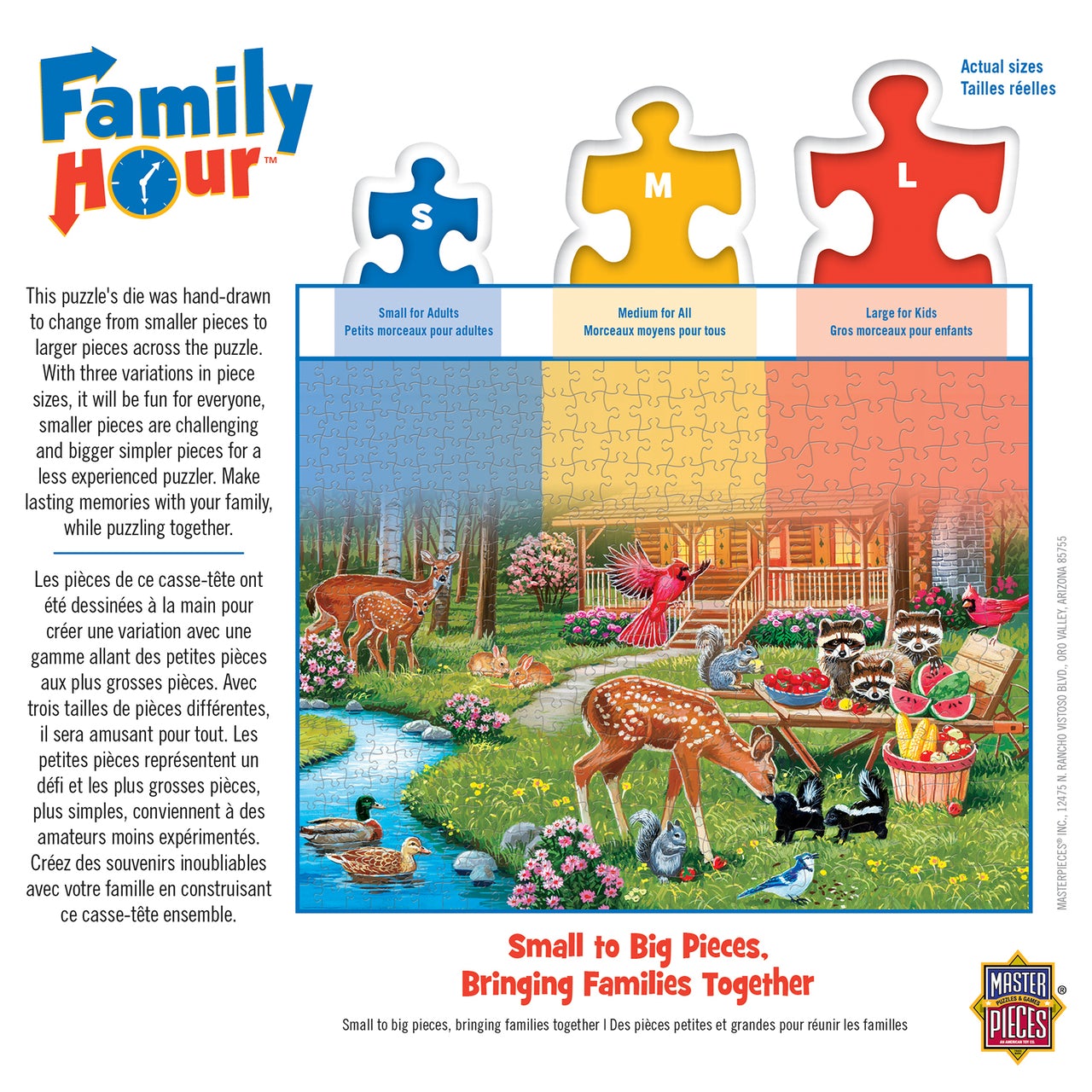 This 400pc Family Hour Collection are the perfect puzzles to enjoy with the family. Creekside Gathering is a quaint cabin with fun forest animals gathering at the nearby creek. This puzzles die was hand drawn to change from smaller to larger pieces across the puzzle. A variety of puzzle piece sizes are included so that there is a section for everyone. With three variations in piece sizes, it will be fun for everyone!