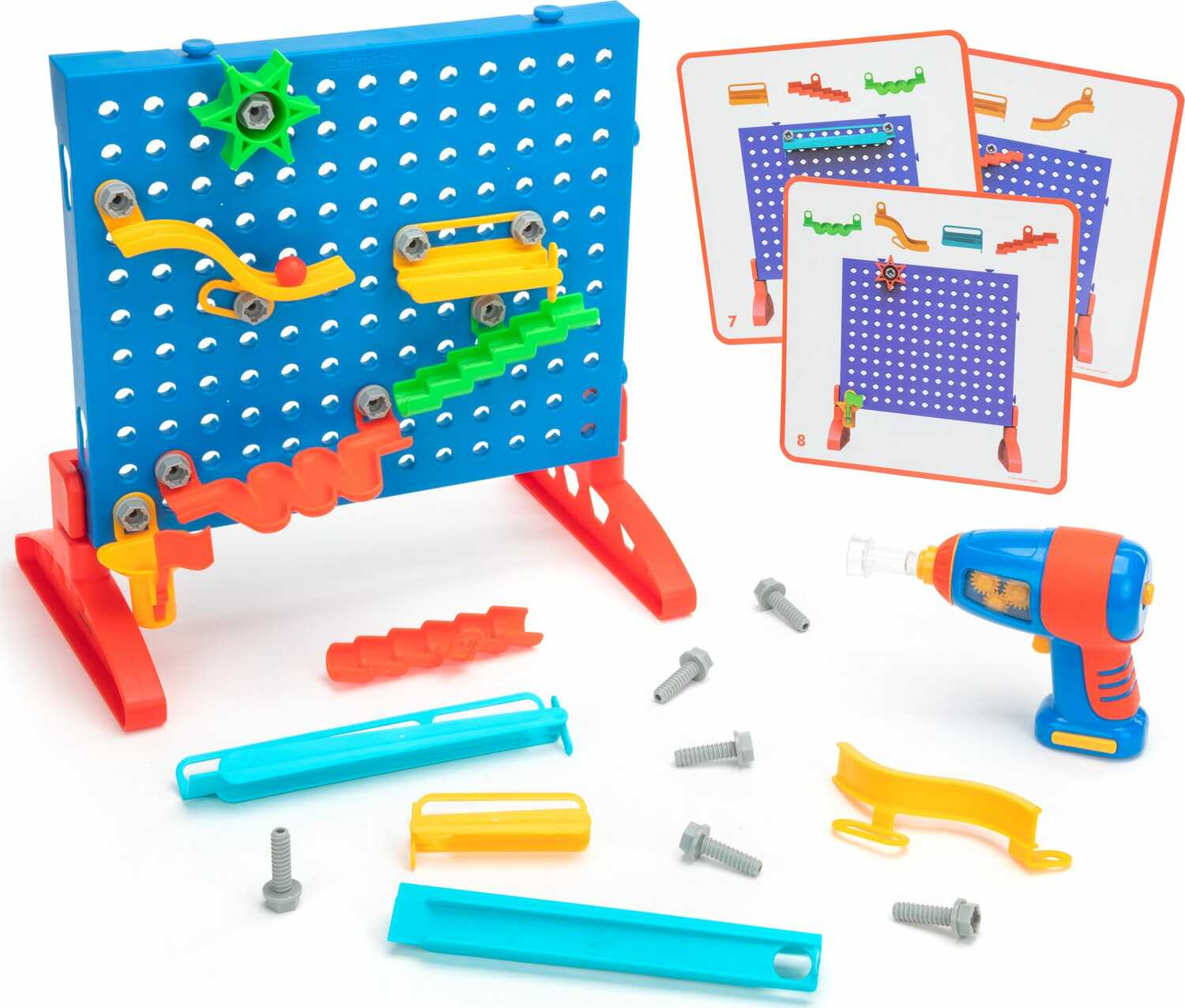Construction play meets engineering with this hands-on, DIY maze maker. Mini-makers use a kid-friendly power drill and colorful bolts to attach 15 track pieces of varying length and shape to complete 10 different maze challenges.