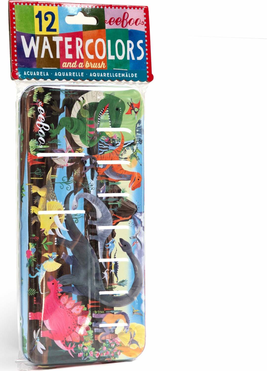 High-quality watercolors and a brush in a beautiful tin box featuring bright and delightful dinosaur artwork by Linda Bleck. A perfect companion to eeBoo's watercolor pads. Develop skills and build confidence while exploring color, media, and self-expression.