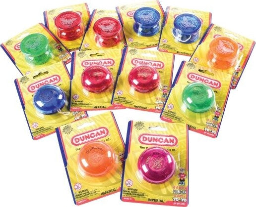 Combo pack of butterfly and imperial yo-yos. Made of plastic. 12 yo-yos per unit.