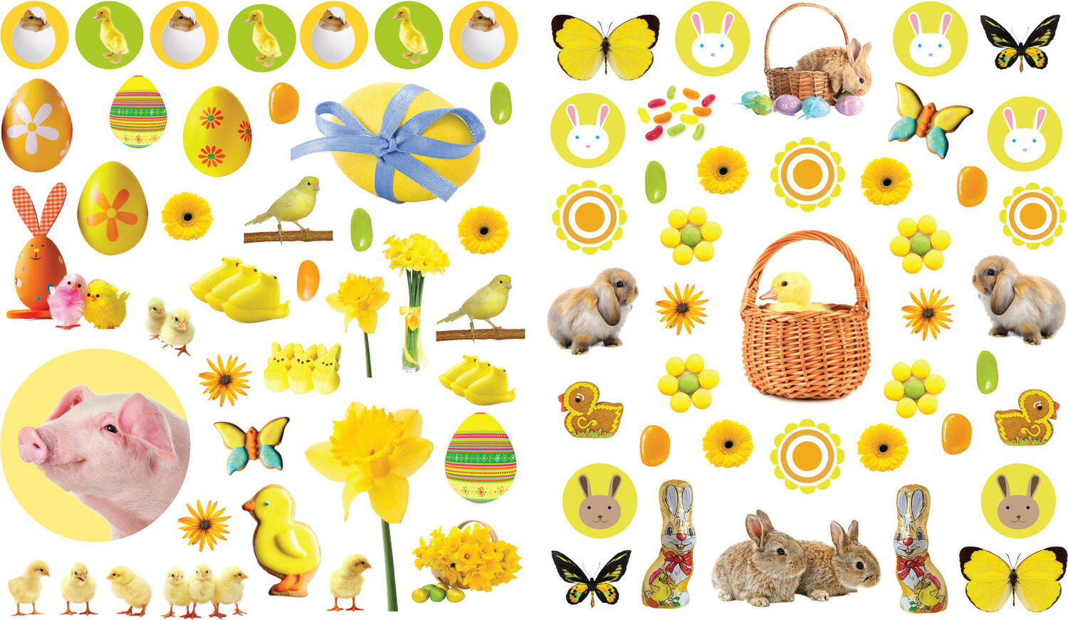 Fuzzy chicks and bouncy bunnies. Jelly beans, springtime flowers, pretty painted eggs, and wobbly-legged lambs. Use them to decorate notebooks, cards, scrapbooks, crafts, party invitations or create a lively scene on the book’s inside covers—which double as a glossy illustrated background. Then change it up when the mood strikes.