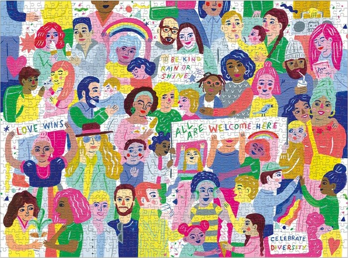 Piece together All Are Welcome Here! 1000 Piece Family Puzzle to reveal a colorfully illustrated collage showcasing human diversity and acts of kindness.