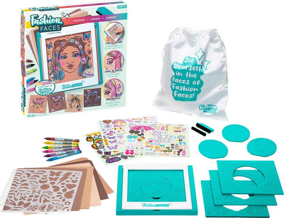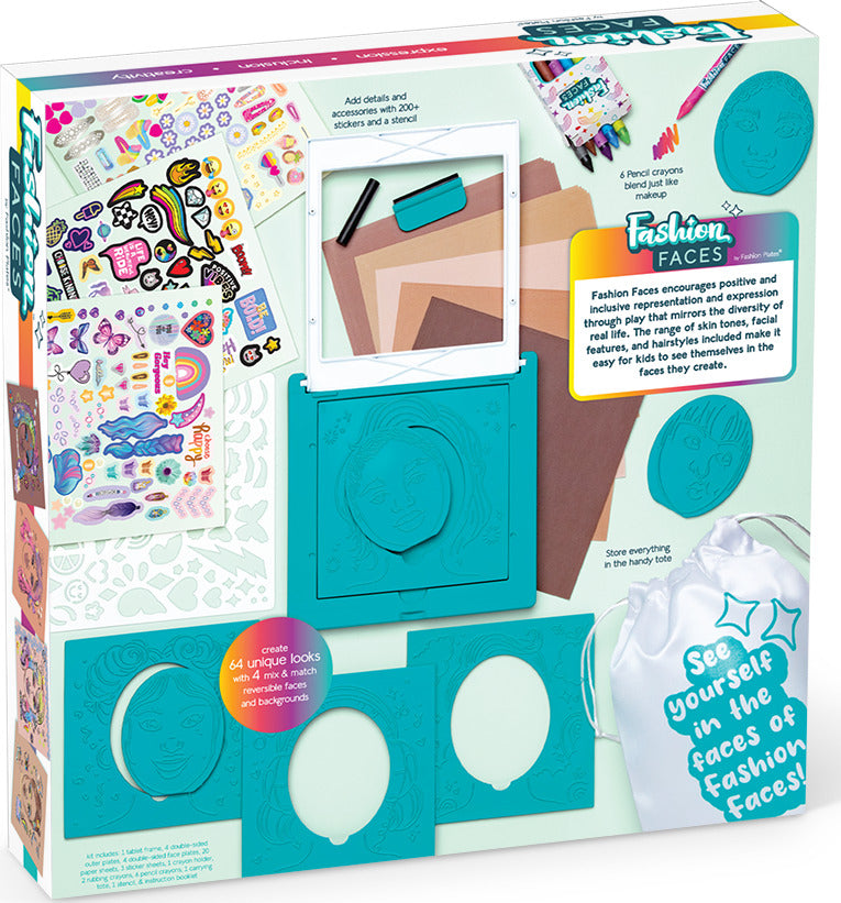 Fashion Faces encourages positive and inclusive representation and expression through play that mirrors the diversity of real life. The range of skin tones, facial features, and hairstyles included make it easy for kids to see themselves in the faces they create."