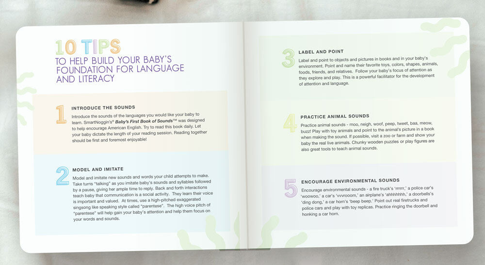 SmartNoggin has developed a research-based board book with a powerful agenda… SmartNoggin’s Baby’s First Book of 44 SOUNDS™ includes all 44 sounds of American English in a colorful board book that is ready to help start a baby on their language and literacy journey. This book allows your baby to hear each sound used in a word and then pronounced in isolation, with the goal of helping your baby’s brain strengthen the neural connections needed to speak and read in the months and years ahead.