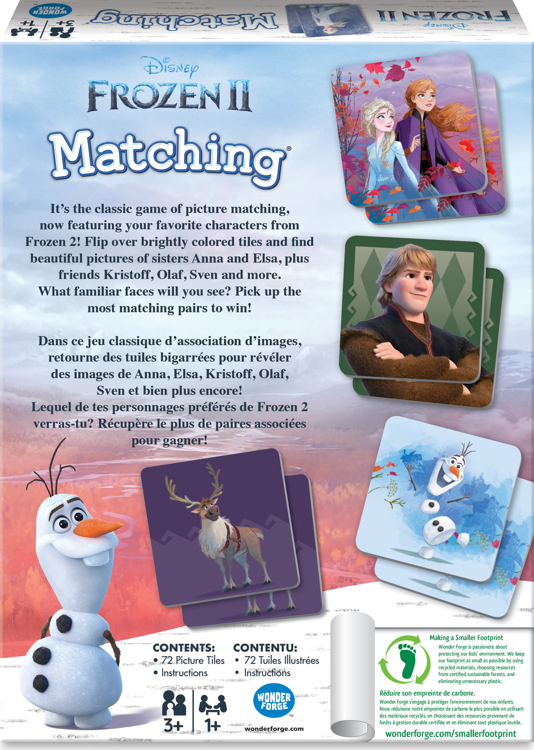 It's the classic game of picture matching, now featuring your favorite characters from frozen 2! Flip over brightly covered tiles and find beautiful pictures of sisters Anna and else, plus friends Kristoff, Olaf, Sven and more.what familiar faces will you see? Pick up the most matching pairs to win!
