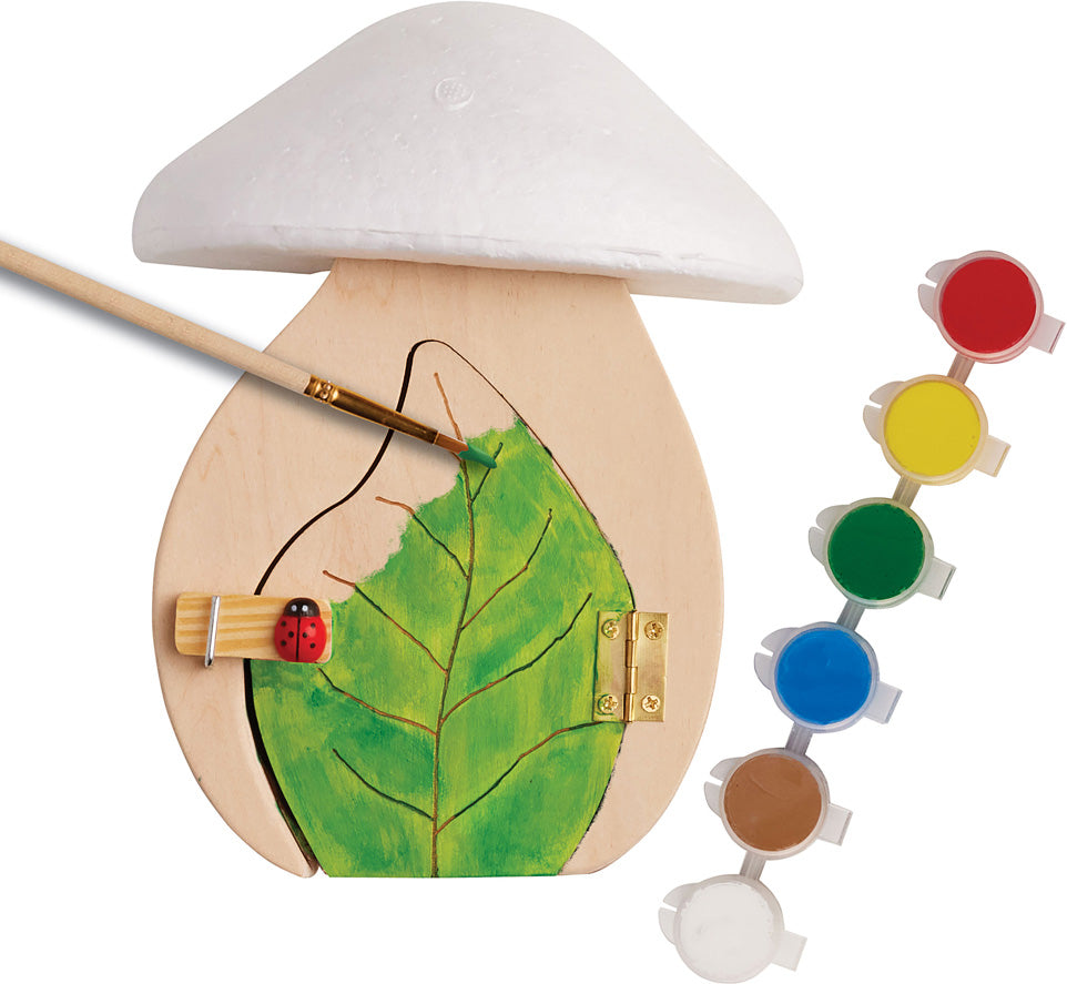 Mushroom-shaped wooden gnome home comes ready to decorate with weather resistant paint, a friendly gnome, mini mushrooms and plenty of gnome accessories.