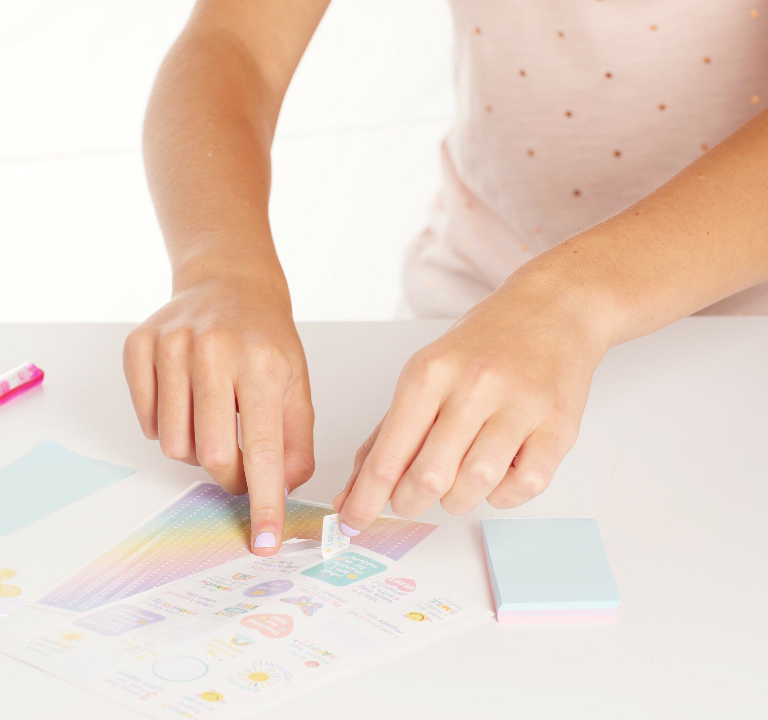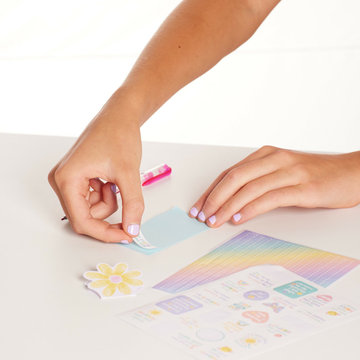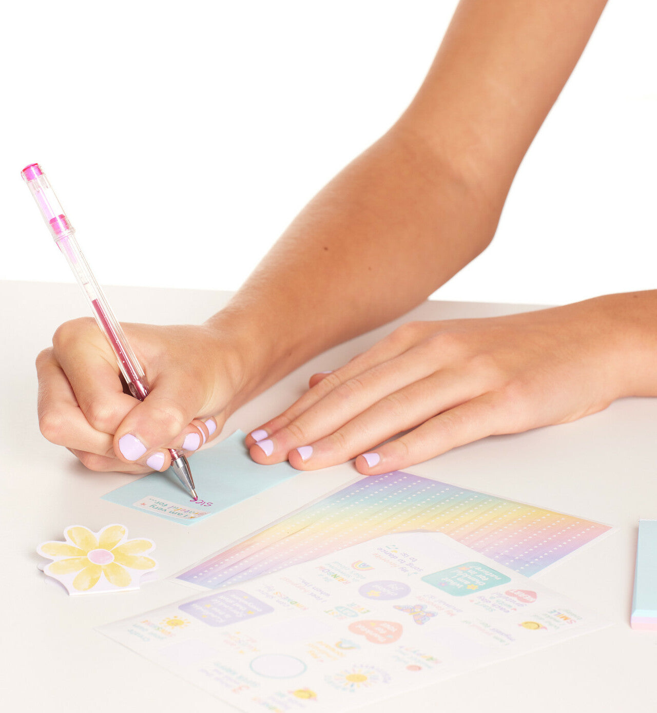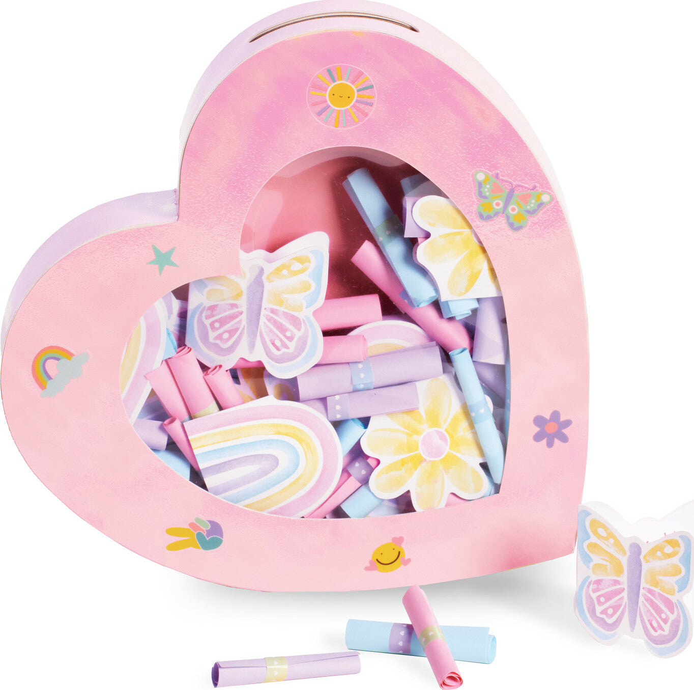 Happiness Bank includes 30 mini cards, 90 paper scrolls with seals, sticker gratitude prompts, gel pen, and plenty of stickers for decorating