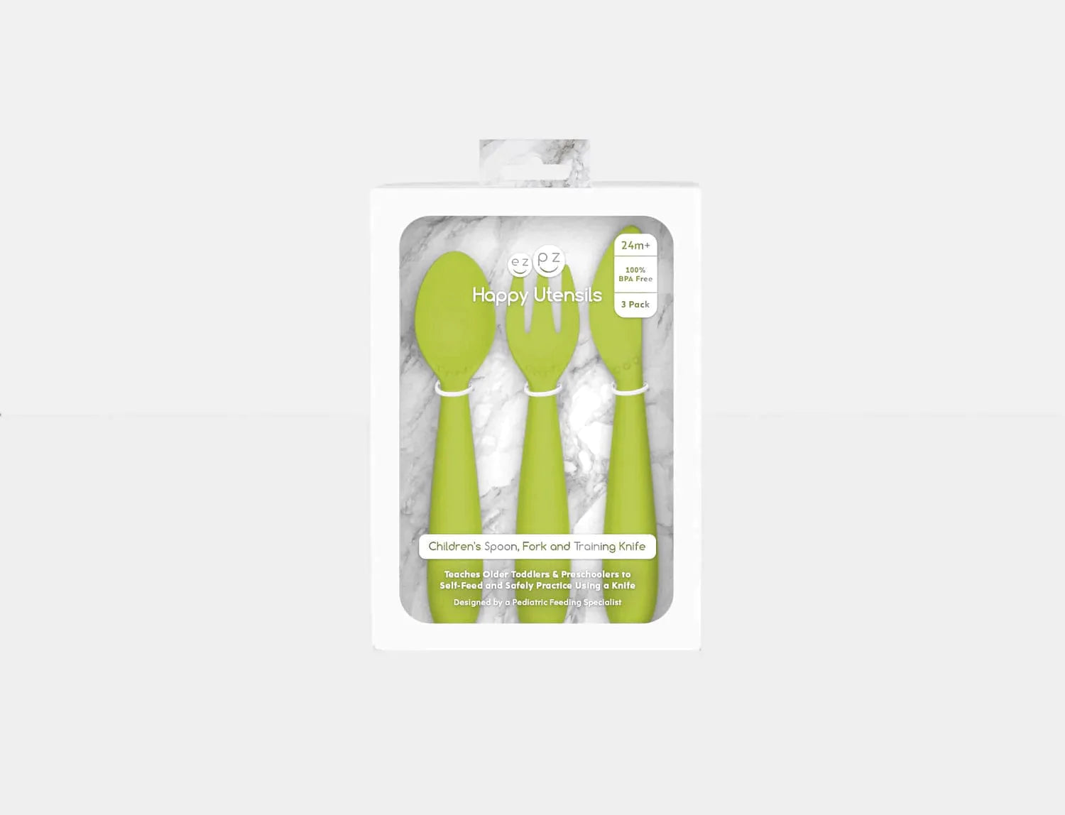 Learning self-feeding skills with utensils is an important developmental milestone. The ezpz Happy Utensils are designed to help older toddlers / preschoolers independently eat with a spoon and fork, and safely practice using a knife (spreading + cutting).