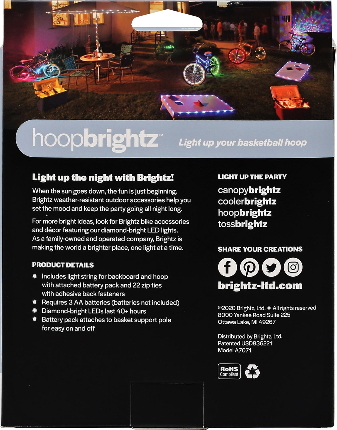Don’t lose sight of your hoop because it gets dark! Keep ballin’ with Hoopbrightz to outline your backboard AND rim with 1 battery pack! They install on any backboard with the included zip ties and adhesive backed fasteners. The battery pack adheres to the pole of the basketball hoop so it's within reach.
