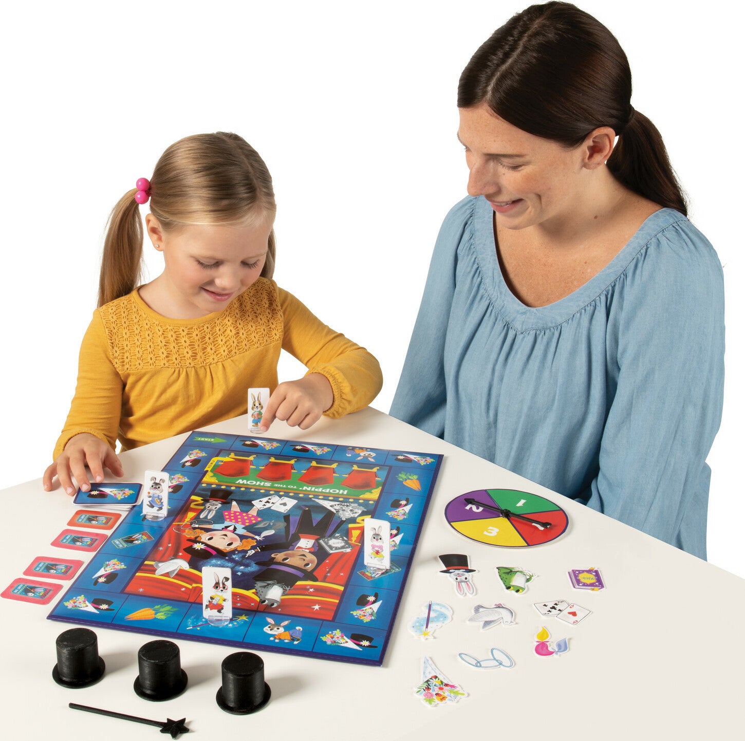 - Includes 1 game board, 13 assistant cards, 1 spinner, 9 magic prop tokens, 4 bunnies with stands, 4 tickets, 1 magic wand, 3 magic hats and instructions.