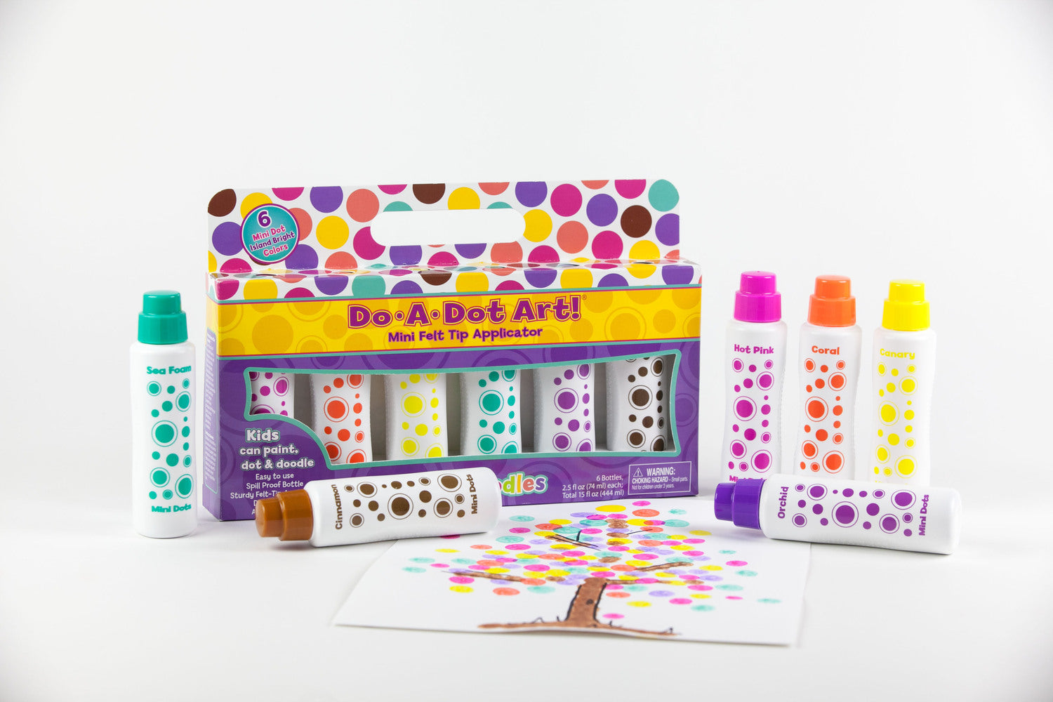 Mini Dots & Doodle Painters Sturdy mini felt tip is great for drawing & dotting & its a great complement to our regular DotArt Marker to add more creativity & Color mixing for your new unique art projects. Colors Include: Lavender, Sea Foam, Lemon, Coral, Magenta & Cinnamon Brown. Non-clog Formula , Spill Proof Bottle ( 2.5oz - 74ml ). Made in the USA.