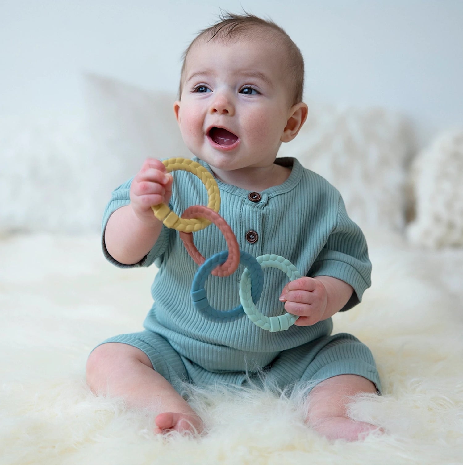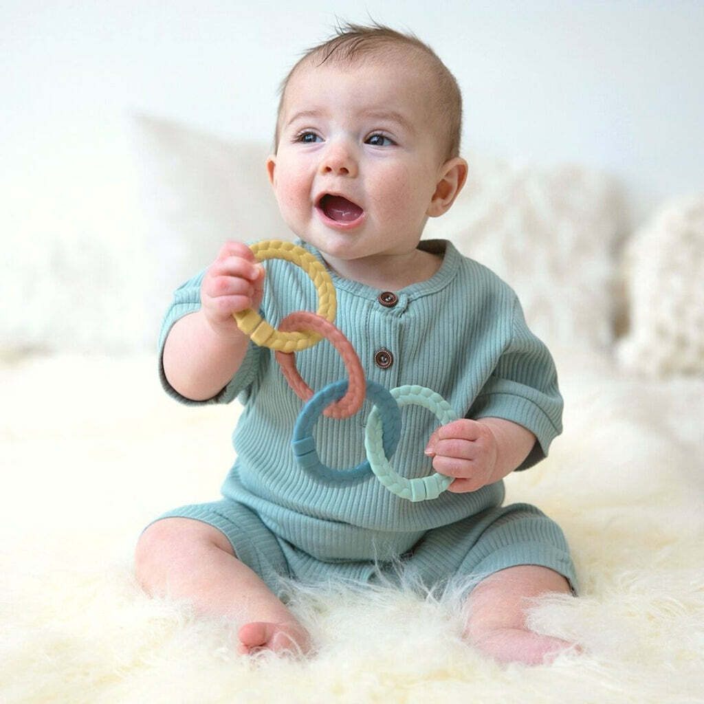 Love these baby links for little ones! A rainbow of color & endless entertainment awaits with the Ritzy Rings™ from our Bitzy Bespoke™ collection! These toy links are ultra-versatile with various ways to play. Watch as baby’s hands stay busy shaking and tugging the rings. Easily keep toys nearby by using the rings to attach to play gyms, car seats, strollers and high chairs. The braided ring features a subtle texture designed to soothe baby’s sore gums.