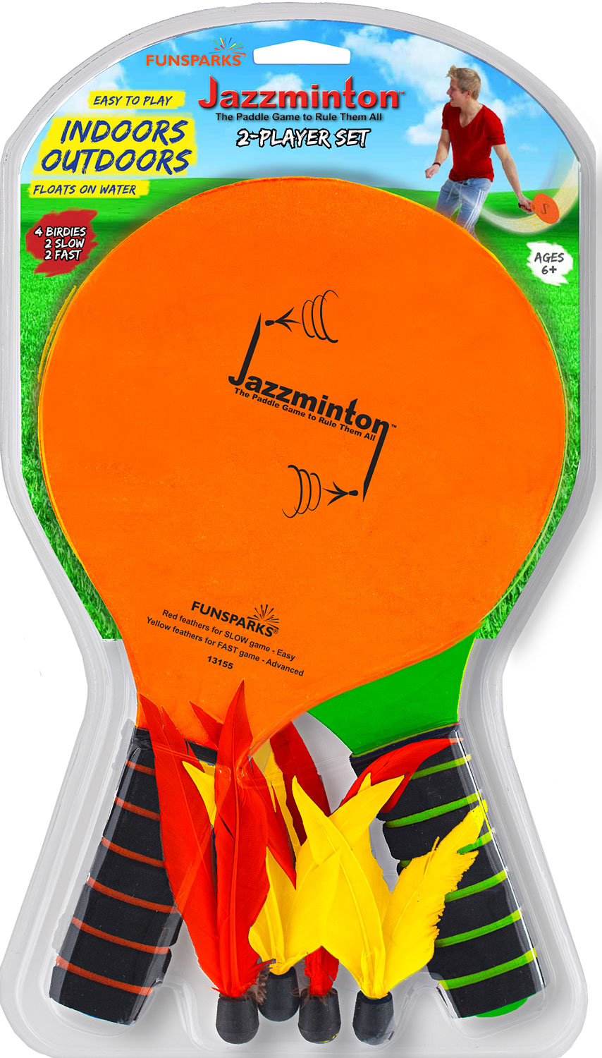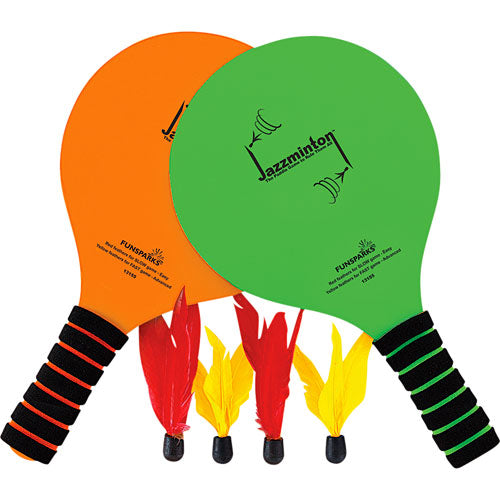 Jazzminton Original, by Jazzminton Includes 2 paddles (fluorescent - 1 orange,1 green), paddles with comfortable foam grips, 2 slow red birdies, 2 fast yellow birdies
