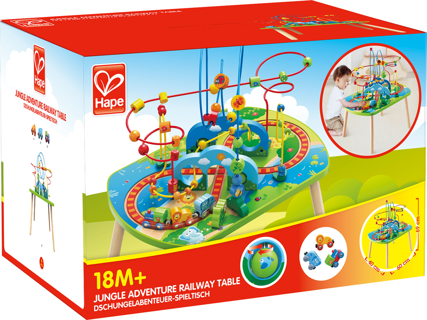 Explore the jungle and its animals with this awesome child-sized play table. Drive the jungle train across the African-themed landscape, through the arches, and make the birds "fly". But watch out for the silly monkeys trying to block the way! Includes an elaborate bead maze featuring colorful jungle insects. For ages 18 months and over.