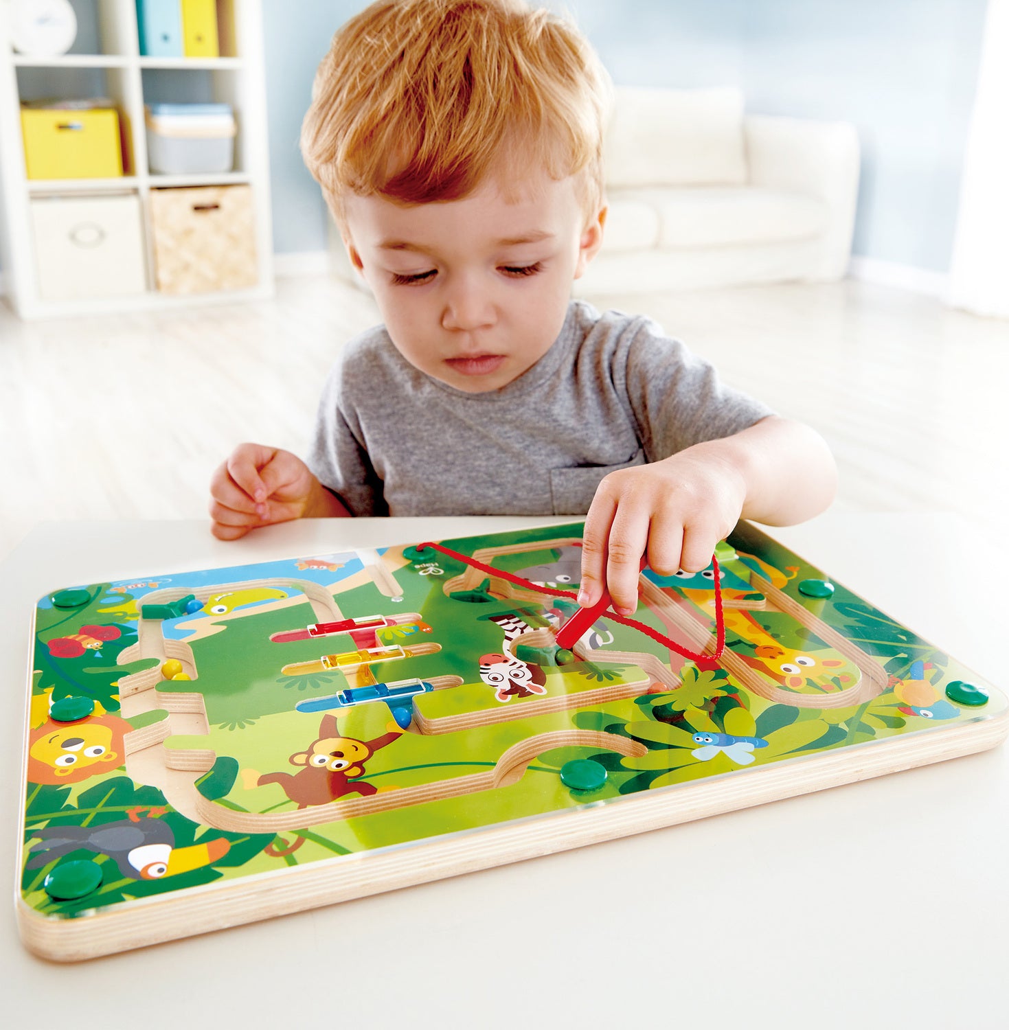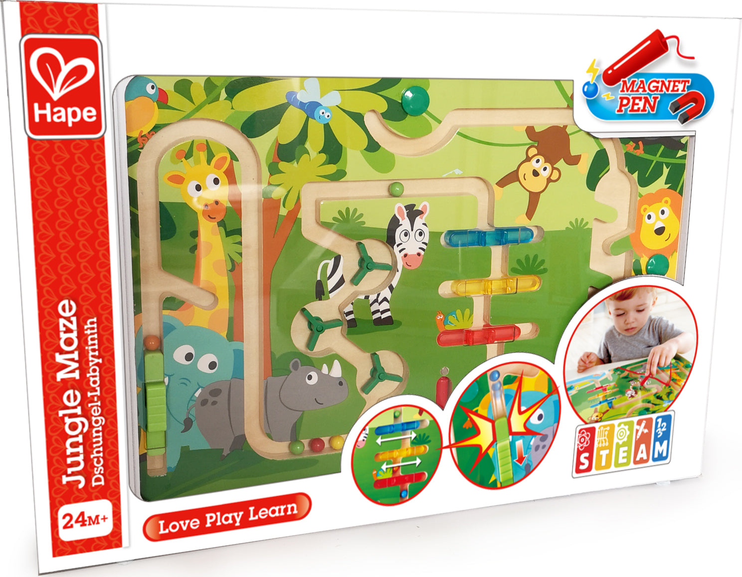 This fun magnetic maze is a fun way to travel through the jungle and learn about our wild animal friends. You can tilt the board or use the wand to guide the magnetic balls through the maze of pathways, corners and revolving doors!